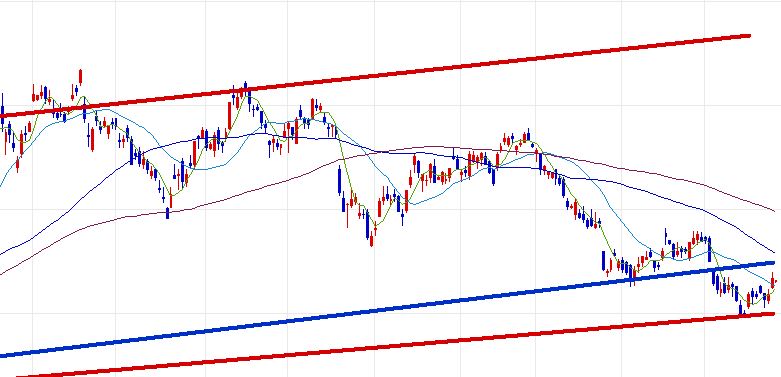 위 이미지를 확대해 보시면 기존에는 파란색 추세선에서 지지해 주었으나,
